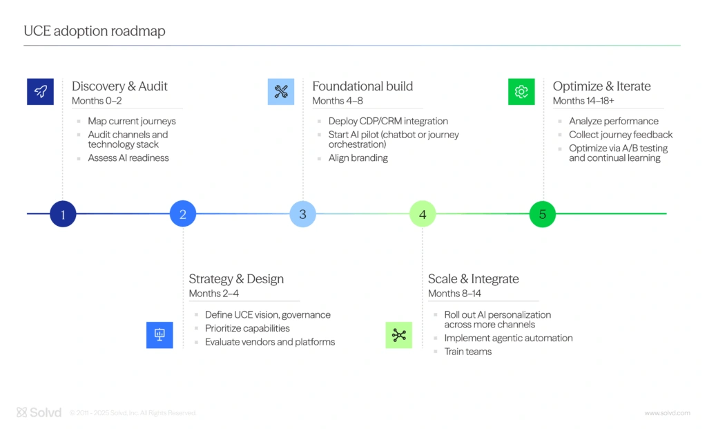All these success cases make one thing clear: unified brands grow faster, serve customers more efficiently and build more resilient trust. The UCE implementation influences both communication between brands and customers, as well as customers’ experience and trust, resulting in increased efficiency. What is often overlooked, but should be in mind, is that implementing UCE is a cohesive organizational shift, not a plug-and-play feature. Therefore, it requires a strategic approach, including aligning C-suite stakeholders around a single primary goal and strategy and selecting and integrating the right platforms based on your specific needs. The next step is to integrate AI on this foundation, in both ethical and responsible way and finally, continuously optimize it through data and feedback loops. To do so, here is a practical roadmap, key success metrics and cultural shifts required for UCE mastery.