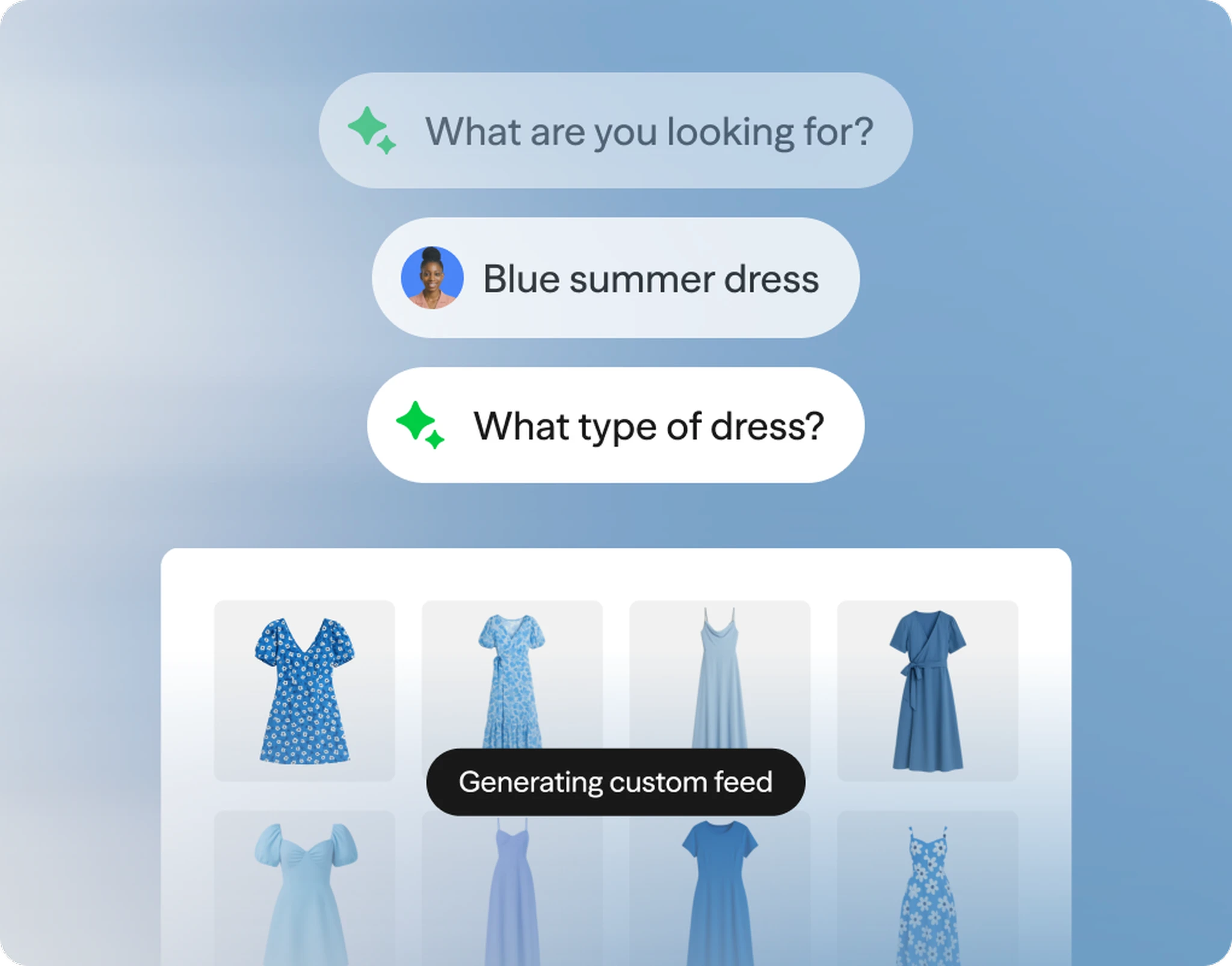 A small number of pre-constructed outfits with static imagery transforms into engaging conversations about taste, fit or occasions that yield compelling product recommendations.